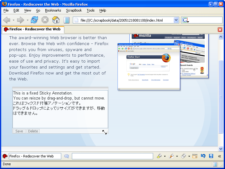 As with Bookmarks, we can access to saved page from the Firefox menubar. Unfortunately, drag-and-drop and right-click are not supported in ScrapBook menu. |