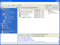 Import / Export tool helps you to transfer among two ScrapBook trees. Right hand of the window is the list of exported items. First you need to set the path by clicking 'Browse...' button. By dragging tree item (left) and drop on the list (right), you can export items. By dragging list item (right) and drop on the tree (left), you can import items. The way of this feature: (1) move ScrapBook data among two ScrapBooks on one PC. (2) move and merge ScrapBook data among two PCs. For example, you can move data from one PC to another by: (1) Exporting ScrapBook data to USB removable disk (2) Importing them on another PC |
